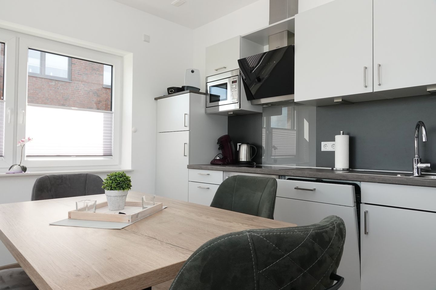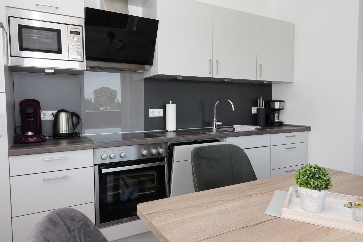 Die Einbauküche ist ausgestattet mit einer Spülmaschine, einem Backofen, einem Cerankochfeld, einer Mikrowelle sowie einem Kühlschrank mit Doppel-Gefrierfach.