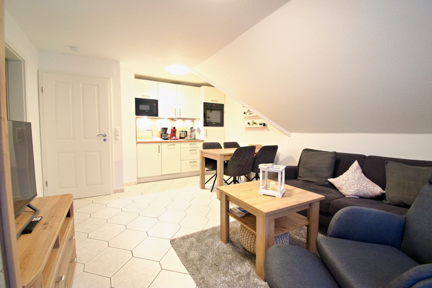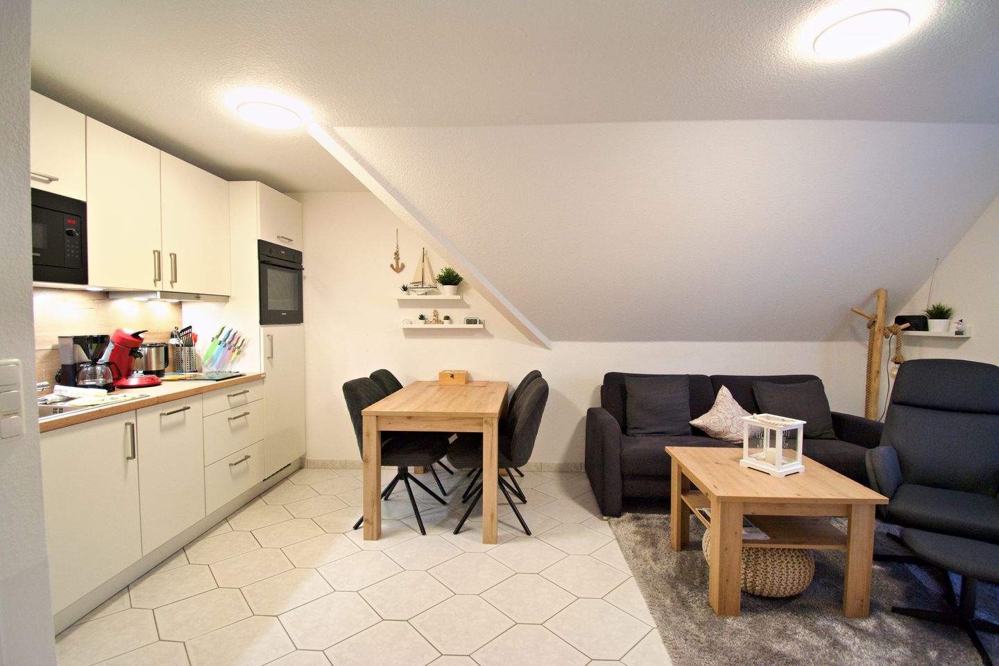 Der offene Wohn- und Essbereich der Ferienwohnung Möwengruß empfängt Sie mit einer hochwertigen, modernisierten Einrichtung, die 2024 vollständig renoviert wurde. Hier erwartet Sie eine gemütliche Atmosphäre zum Wohlfühlen und Entspannen. Ein moderner 43-Zoll-Smart-TV, ein Radio sowie kostenloses WLAN sorgen für abwechslungsreiche Unterhaltung – ideal nach einem erlebnisreichen Tag an der Nordsee.